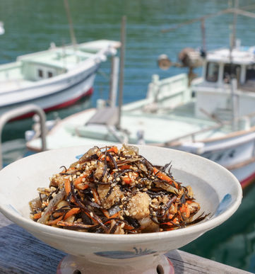 沖家室ひじきは先に混ぜて炊くよりも、炊き上がってから最後に⼊れる「あと混ぜ」がオススメ。⾷感と⾵味が残っておいしいです。